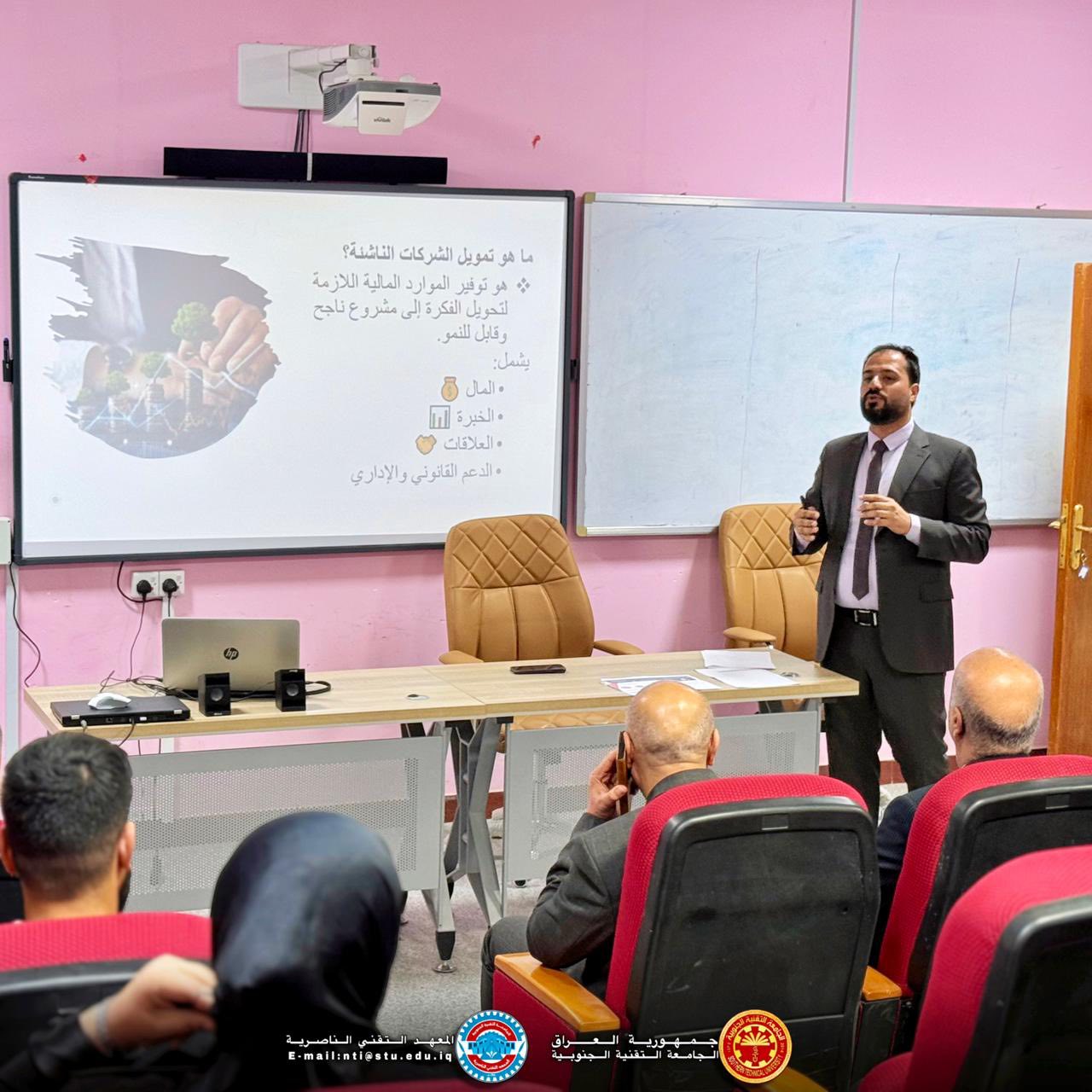 ضمن فعاليات الاسبوع العالمي لريادة الأعمال وبرعاية السيد رئيس الجامعة التقنية الجنوبية الأستاذ الدكتور (عدنان عبد الله عتيق) واشراف الاستاذ الدكتور (خوام ريسان حسين) عميد المعهد التقني الناصرية تواصل شعبة حدائق العلوم التكنولوجية في المعهد بإقامة الورش العلمية التي تهدف الى تسليط الضوء على مدى تطور التقنيات الحديثة في مجالات التكنولوجيا المتقدمة والإبداعات التقنية الفنية التي تسهم بشكل فعال في حياتنا اليومية. حيث اقيمت ورشة عمل بعنوان ( أدوات التمويل الحديثة للمشاريع الناشئة ) الذي ألقاها الدكتور ( خلدون طالب فالح ) رئيس قسم تقنيات المدنية.