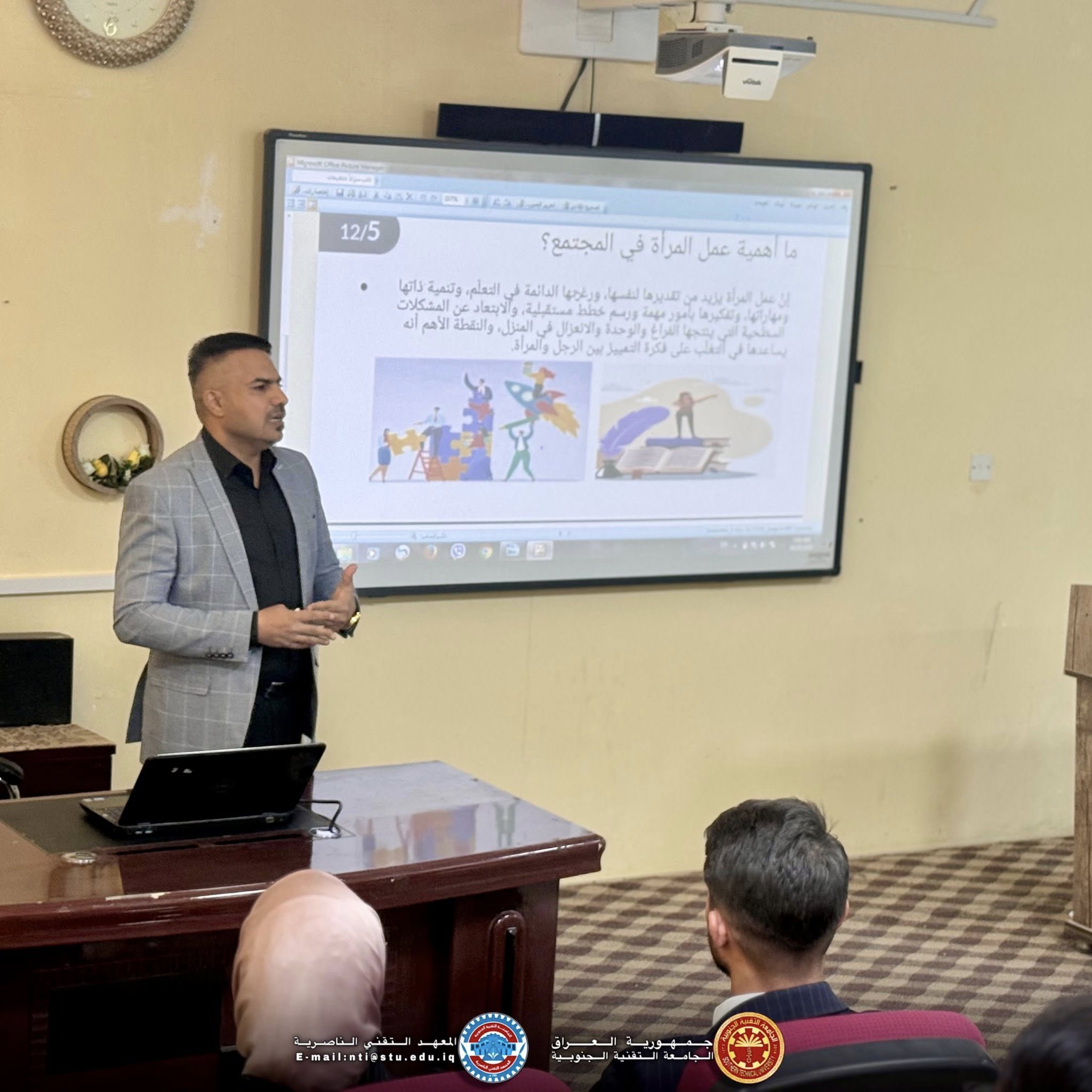 نظمت وحدة شؤون المرأة في المعهد التقني الناصرية و بالتعاون مع المفوضية العليا لحقوق الإنسان مكتب ذي قار ورشة عمل بعنوان ( اهم التعديلات القانونية والإدارية التي ترمي الى ضمان حقوق المرأة في العمل ) الذي حاضر من خلالها الدكتور ( كريم كاظم الركابي ) من المفوضية العليا لحقوق الانسان.