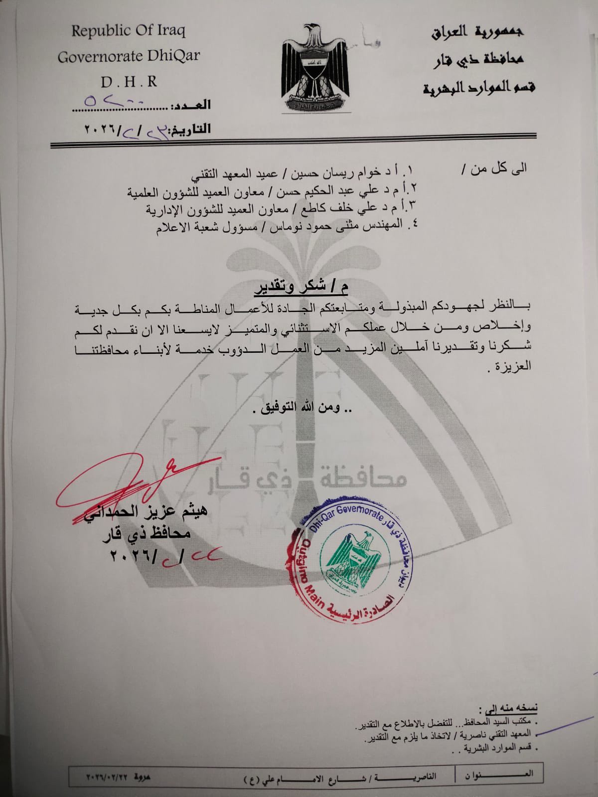 السيد محافظ ذي قار يمنح كتاب شكر وتقدير إلى عمادة المعهد التقني الناصرية شعبة الإعلام والاتصال الحكومي بعد النجاح في استضافة الملتقى العالمي لمكافحة التطرف العنيف المؤدي الى الارهاب الذي احتضنته عمادة المعهد التقني الناصرية منح السيد محافظ ذي قار الاستاذ (هيثم عزيز الحمداني) كتاب […]